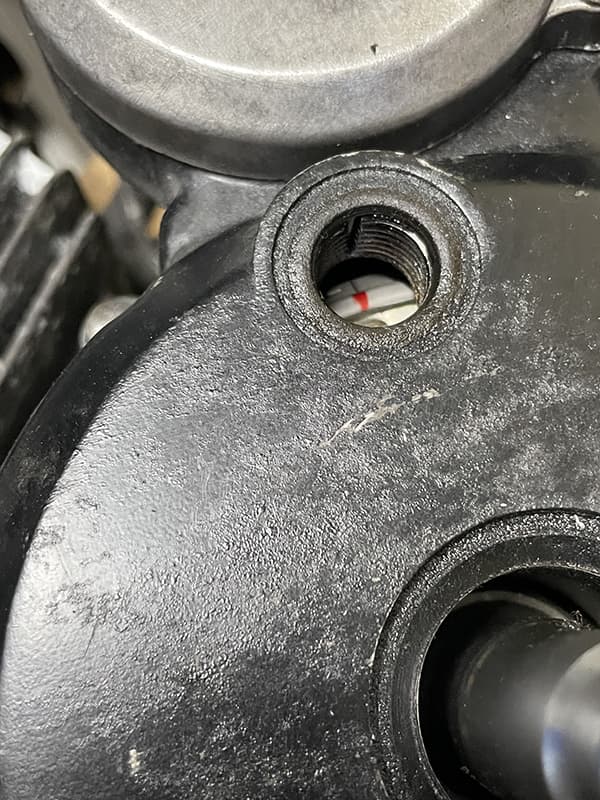 覗き窓の上死点ですが、非常にみえずらいので、赤マジックで印をつけました